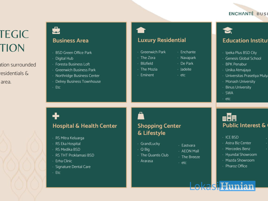 - Dikelilingi dengan potensial market hunian premium seperti Enchante Residence, The Zora, Greenwich Park, The Mozia, Jadeite, Blizfield, Nava Park, dll.