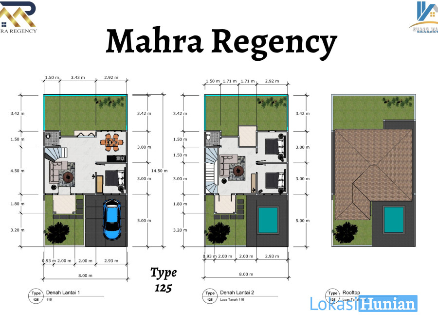 Type 125, rumah 2 lantai dengan luas bangunan 125 m2 dan luas tanah 116 m2.