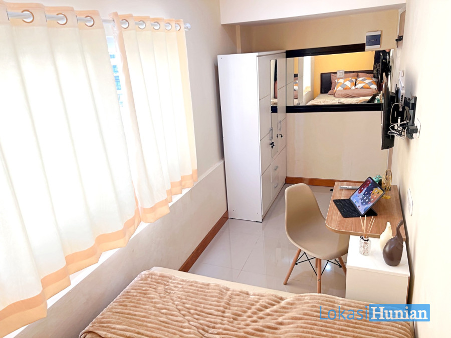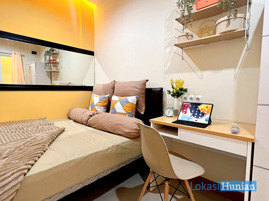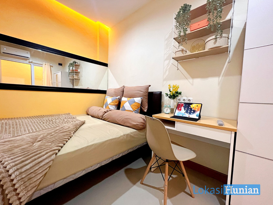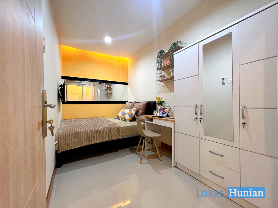 5. Fasilitas Kamar Lengkap + Furniture Baru [Spring Bed - Sprei Anti Air - Bantal Guling - AC Unit BARU - Jendela - Gorden - Wooden Panel dg Cermin Besar - Kursi Nyaman - Meja Kerja/Belajar - Rak Sepatu - Keranjang Laundry