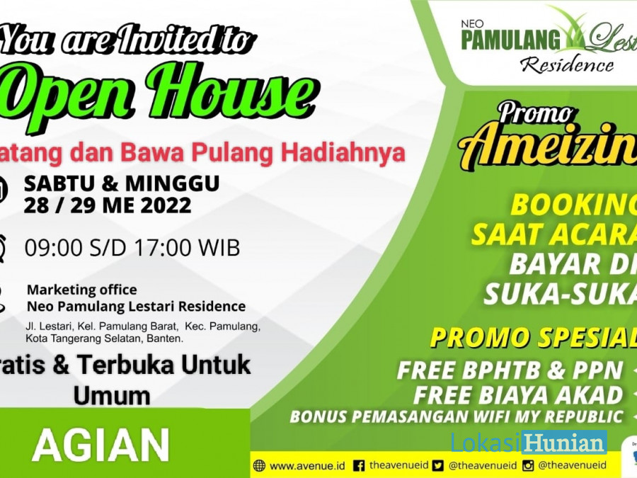 Spesial Open House Sabtu Minggu 28 & 29 Mei 2022 Perumahan Pamulang Lestari :