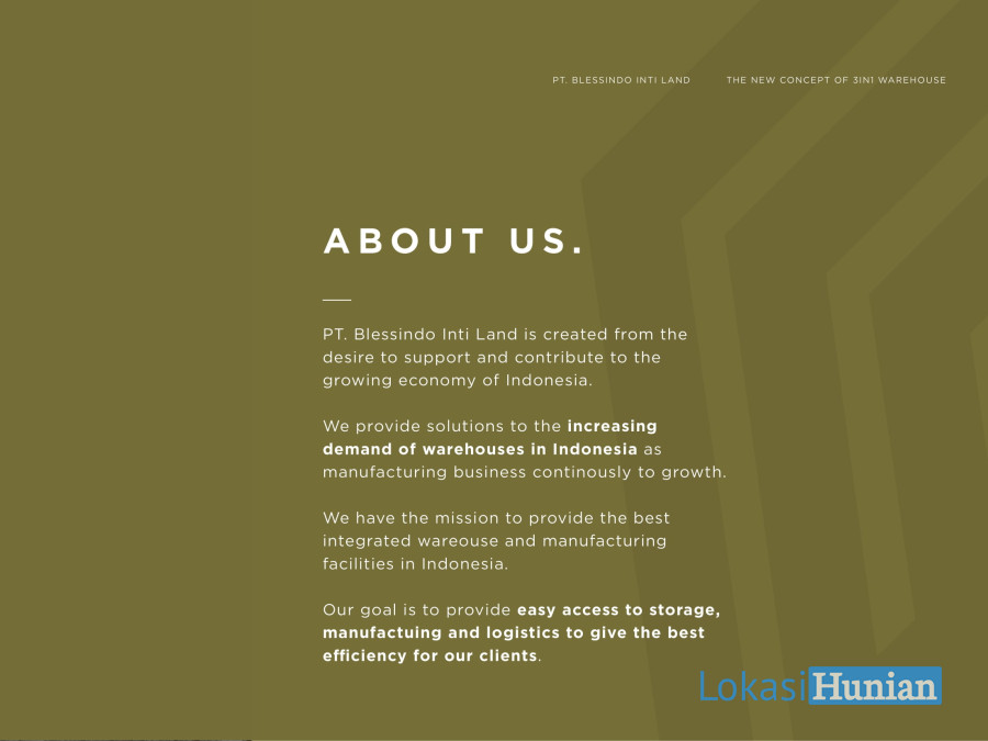 Blessindo Industrial Estate sudah merintis Bisnis Pergudangan ini sejak tahun 2016 dan memiliki Tenant2 Loyal dari Rekanan n Kawan Bisnis dan baru Tahun ini mengungkapkan Jati Dirinya yg selama ini tidak Ditonjolkan..