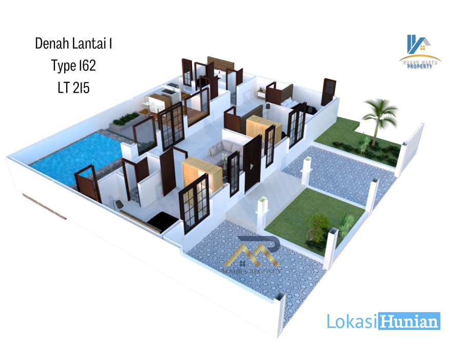 Type 162, rumah 1 lantai dengan luas bangunan 162 m2 dan luas tanah 215 m2.