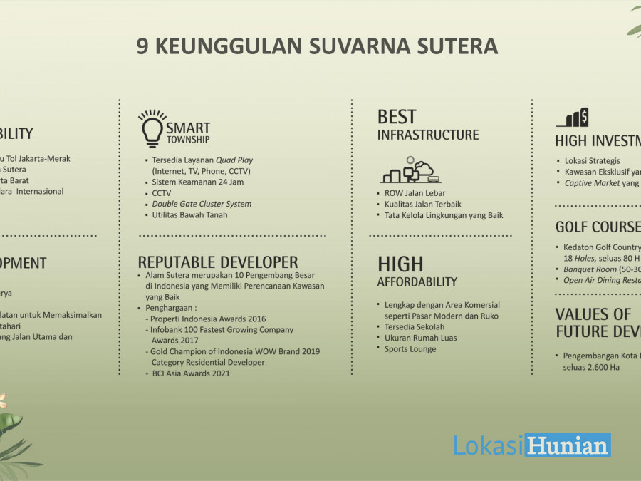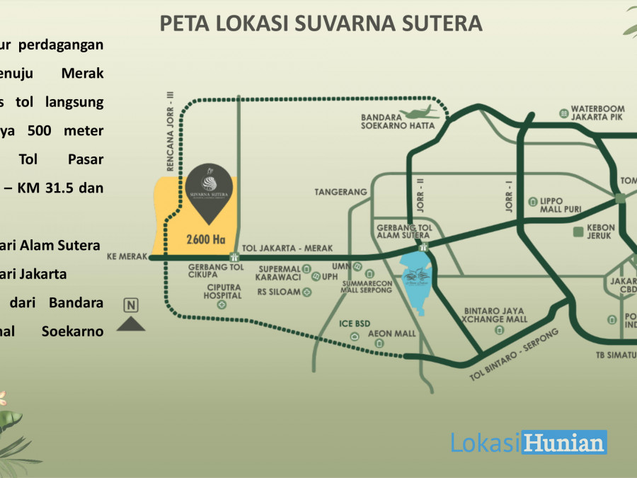 Suvarna Sutera kota baru seluas 2.600 hektar di Tangerang yang mudah dijangkau dengan akses tol langsung, hanya berjarak 30 men