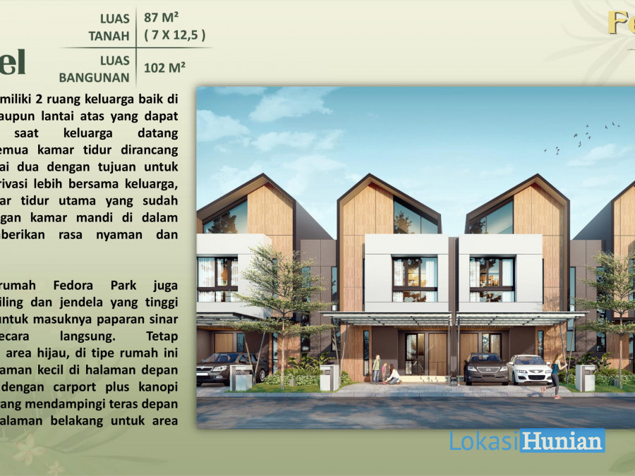 Rumah 2 lantai berdesain modern minimalis, dengan atap asimetris dengan sentuhan warna putih, coklat serta abu-abu yang memberikan kesan clean dan apik. Cluster Fedora Park berlokasi strategis, dekat dengan area Ruko Terrace 9 dan rencana Central Business District.