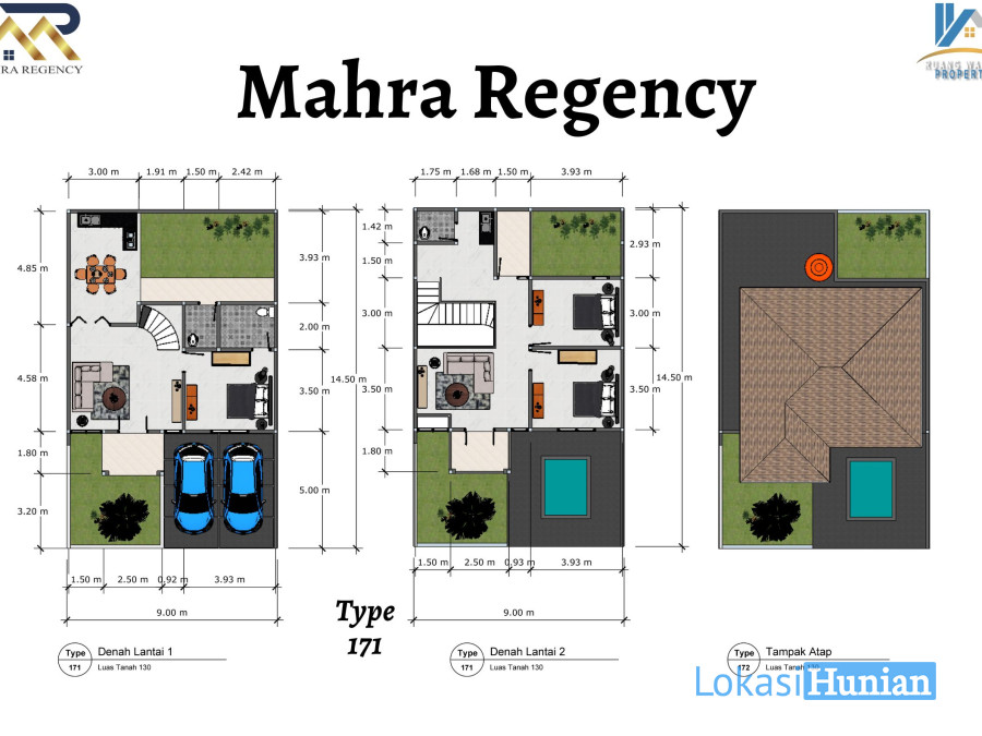 Type 171, rumah 2 lantai dengan luas bangunan 171 m2 dan luas tanah 130 m2.