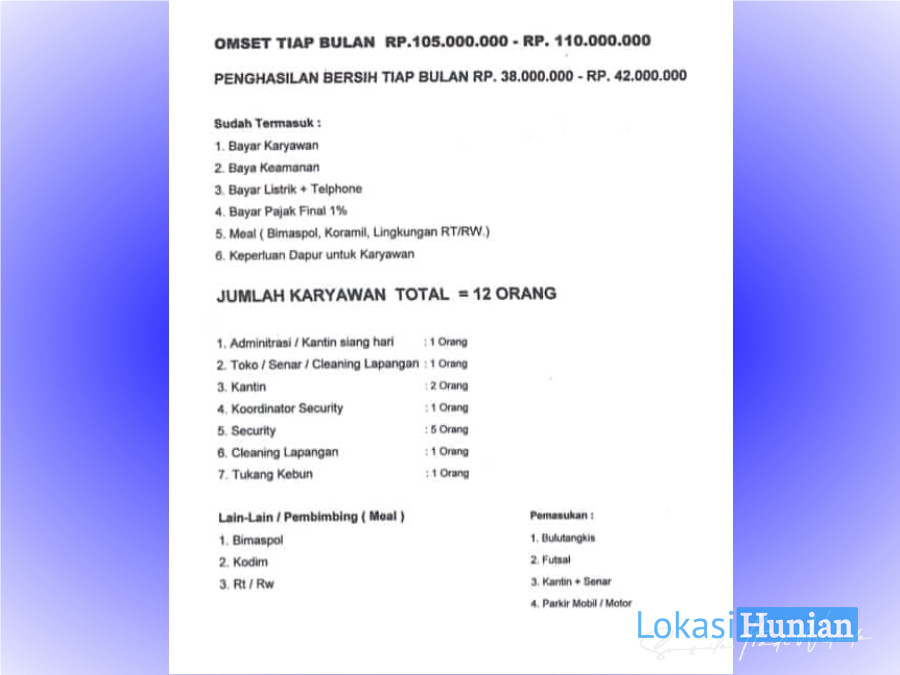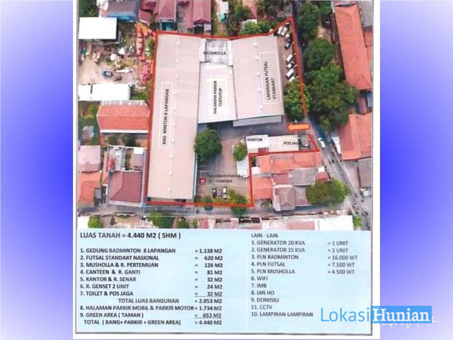 Dijual gedung olahraga (GOR) di Jl. Kali Baru Barat No.8, Kota Baru, Bekasi dengan spesifikasi: