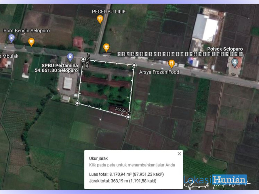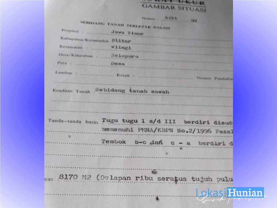 Dijual tanah di jalan propinsi sebelah timur SPBU Selopuro luas 8.170 m² (583,57 ru), SHM, hadap utara, bentuk tanah sangat ideal (lebar depan ± 96 meter), Cocok untuk pabrik atau gudang karena loka si tanah tepat disebelah barat rencana Exit TOL Kepanjen-Tulungagung. Harga Rp 16 jt/ru masih nego.