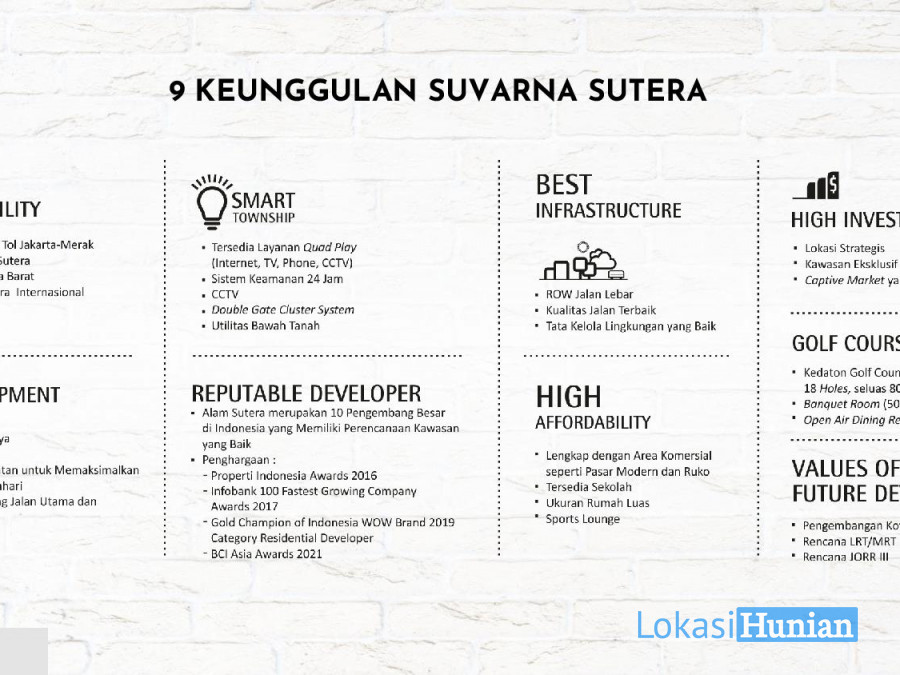 Suvarna Sutera kota baru seluas 2.600 hektar di Tangerang yang mudah dijangkau dengan akses tol langsung, hanya berjarak 30 menit dari Jakarta