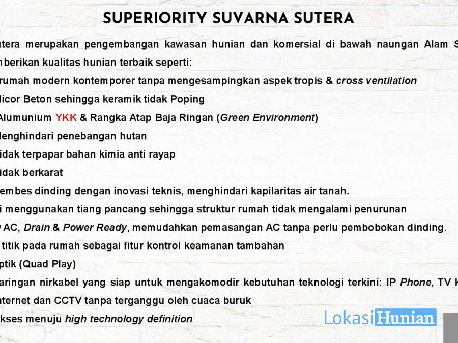 - Lokasi strategis di antara 2 area komersial (Ruko Terrace 8 dan Terrace 9), dekat Sekolah Laurensia dan Pasar 8 Suvarna Sutera