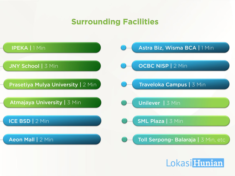 Dekat dengan berbagai potensial market perkantoran, mahasiswa / pelajar seperti, Mozia Loop, Prasetya Mulia, ICE Bsd, Ipeka, Nanyang School, Astra Biz Centre, BCA Tower, Foresta Business Loft 1-7