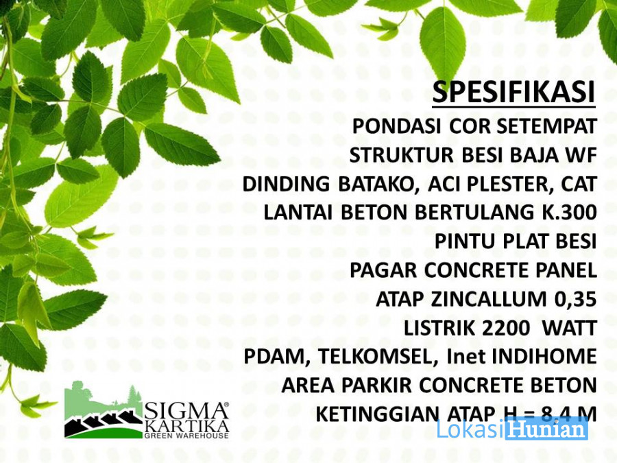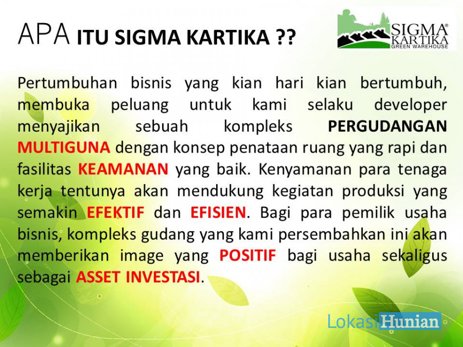 tentunya telah disediakan oleh Sigma Kartika untuk kebutuhan pergudangan, perkantoran, dan industri seperti Jaringan Listrik serta instalasi air dan juga security 24 jam dengan sistem satu pintu (one gate sistem) yang akan menjamin keamanan segala sesuatu yang terdapat di kawasan ini. Tentunya sebagai sebuah kawasan Pergudangan Multiguna, Sigma Kartika akan didukung dengan INFRASTRUKTUR yang lengkap pula seperti Jalanan Beton untuk aksesibilitas container 40ft serta row jalan yang lebar yaitu 20 meter.