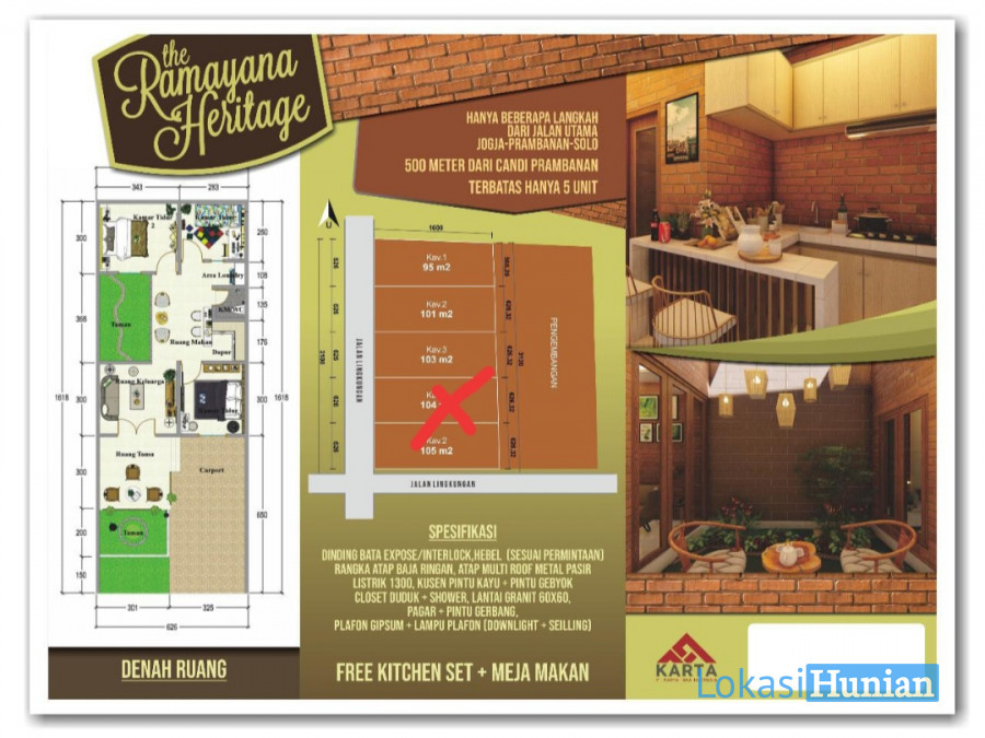 Hunian dengan akses 2 menit ke icon wisata dunia Candi Prambanan, 5 menit ke candi Plaosan dan Candi Ratu Boko, 10 menit ke Tebing Breksi dan Candi Ijo, 10 menit ke Bandara Adi Sucipto,10 menit dari exit tol Prambanan. Miliki sekarang juga.